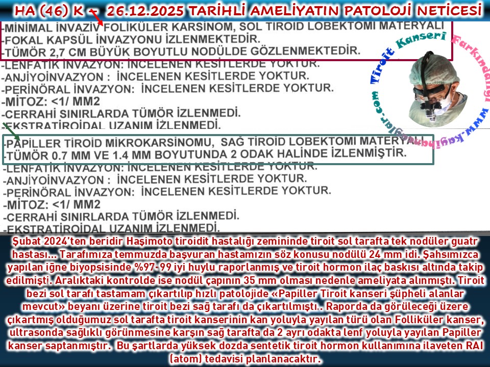 Her iki tarafta da nodül bulunduğundan doğrudan iki taraflı tiroit bezi çıkartılması işlemi uygulanan bir hastamızda kanser saptanmadı, diğerinde 7 mm çapında Papiller Benzeri Noninvaziv Folliküler Tiroit Kanseri (NIFT-P) tespit edildi. Hem çapın <1 cm olmasından hem de NIFT-P’nin artık neredeyse direkt kanser sayılamayabilip kanser öncesi bir durum olabilir, tartışmaları gölgesinde RAI tedavisi gerektirmediği bilgisinden sadece yüksek dozda STH başlandı.