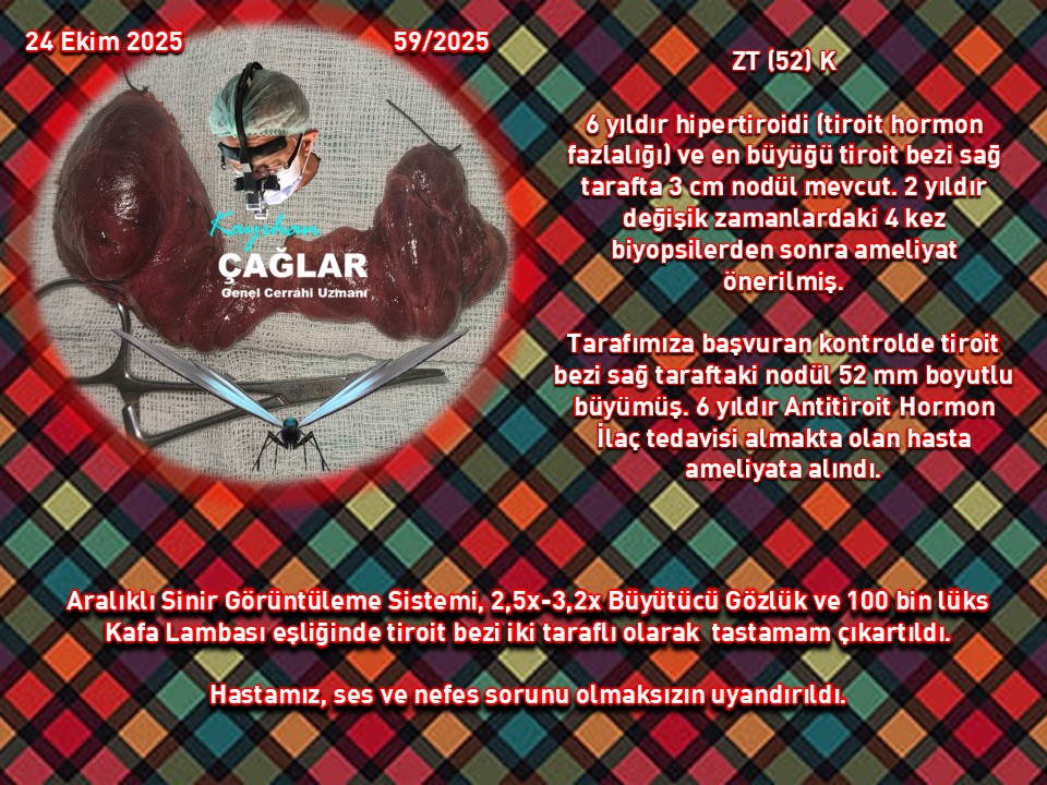 Ekim 2025 döneminde; ikisinde hipertiroidinin (Halk ağzı: Zehirli guatr) eşlik ettiği; birinde sağda 30 mm, solda 25 mm, diğerinde en büyüğü sağda 30 mm; üçüncüsünde de tiroit hormonları normal ancak sağda 40 mm, solda 35 mm olmak üzere çoklu tiroit nodüllü guatr hastalarına iki taraflı tiroit bezi çıkartılması işlemi uyguladık.