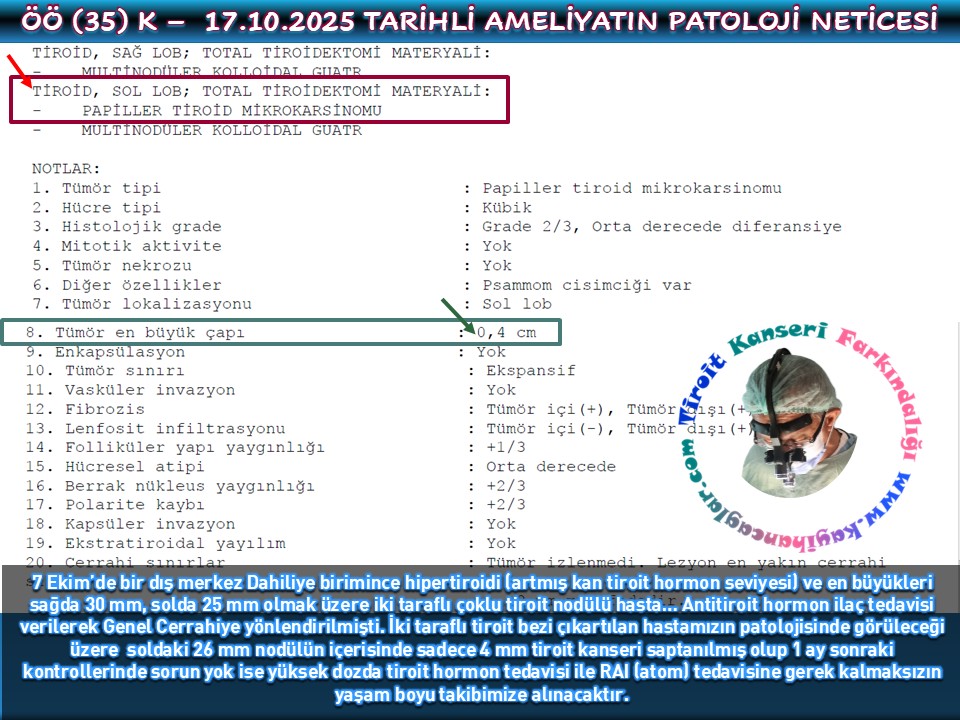 Hipertiroidili çoklu tiroit nodüllü hastalarımızın birinde soldaki 25 mm nodülün içerisinde 4 mm Papiller Tiroit Karsinomu tespit edildi. Yüksek dozda tiroit hormon tedavisi planlanarak RAI (atom suyu) tedavisi haliyle düşünülmemiştir.