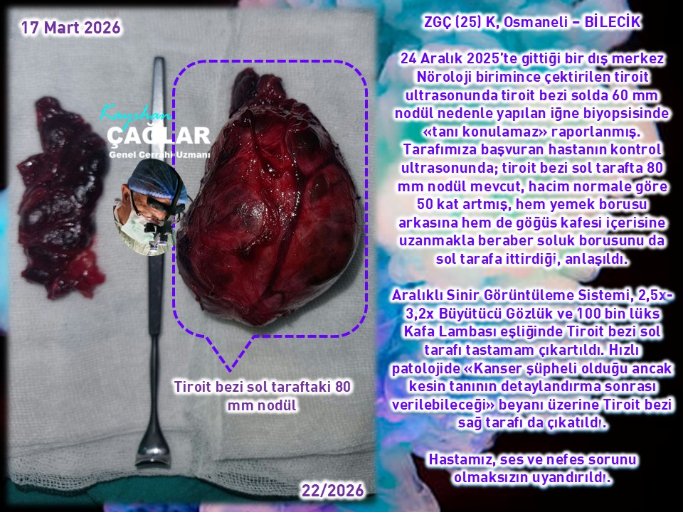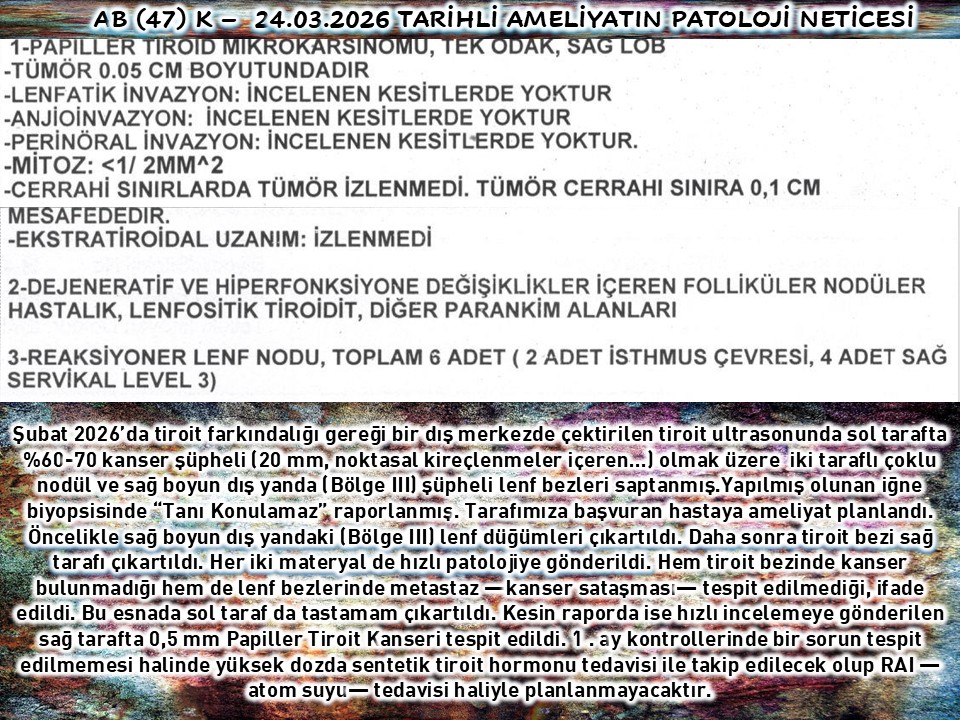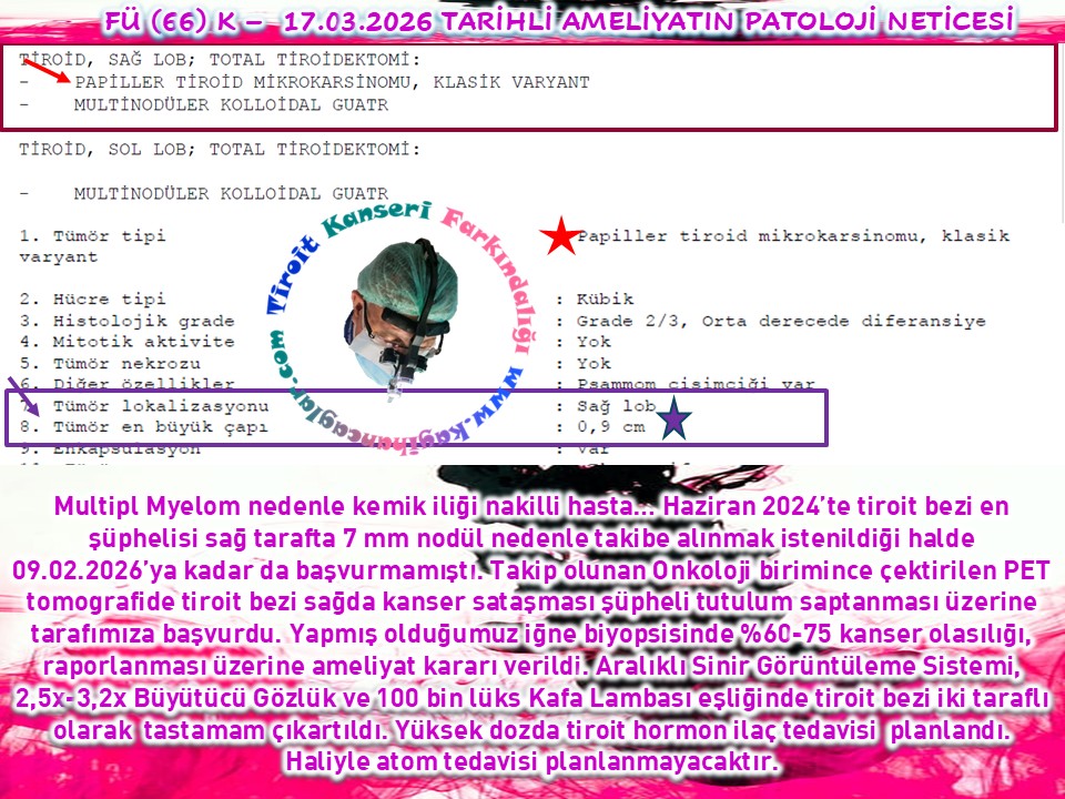 İki taraflı tiroit bezi ameliyatlı 3 hastamızın birinde kanser saptanmadı. Diğer biri kemik iliği nakilli (Multipl Myelom) hasta idi. Haziran 2024’te tiroit bezi en şüphelisi sağ tarafta 7 mm nodül nedenle takibe almak istediğimiz halde 09.02.2026’ya kadar da başvurmamıştı. Takibindeki Onkoloji birimince çektirilen PET’te sağda kanser sataşması şüpheli tutulum üzerine yine başvurduğunda yaptığımız iğne biyopsisinde %60-75 kanser olasılığı, raporlanarak ameliyat edildi. Kesin raporda 9 mm PTK saptandı.