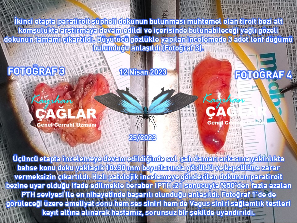 İkinci etapta paratiroit şüpheli dokunun bulunması muhtemel olan tiroit bezi alt komşulukta arştırmaya devam edildi ve içerisinde bulunabileceği yağlı gözeli dokunun tamamı çıkartıldı. Büyütücü gözlükle yapılan incelemede 3 adet lenf düğümü bulunduğu anlaşıldı (Fotoğraf 3).