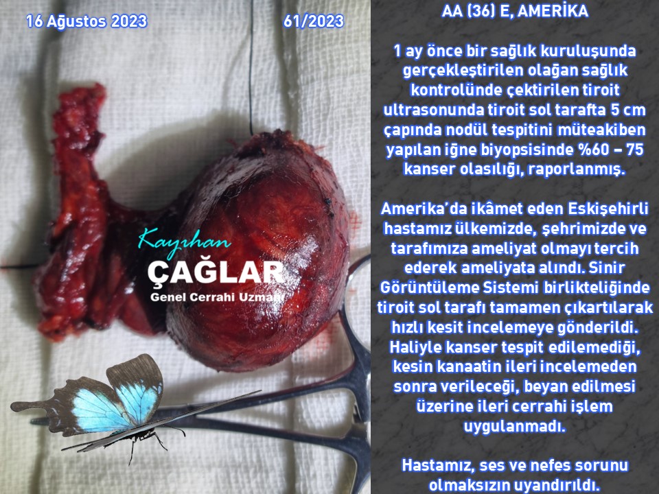 Ağustos 2023'te toplamdaki 13 (on üç) ameliyatımızın 9'u (dokuz) boyun cerrahisi (tiroit / paratiroit / lenf düğümü) ameliyatı olarak teşkil etmiştir. 2023 yılı sekizinci ayında toplam boyun cerrahisi ameliyat sayımız 63 (altmış üç) olmuştur. Dolayısıyla 2023 yılında 7,87 olarak gerçekleşen aylık ortalamamız ile tiroit ameliyatlarında tecrübe sahibi bir cerrah olarak anılmak için gerekli aylık ortalama 8,33' lük ortalamaya yakın bir değere ulaşmış olduk.