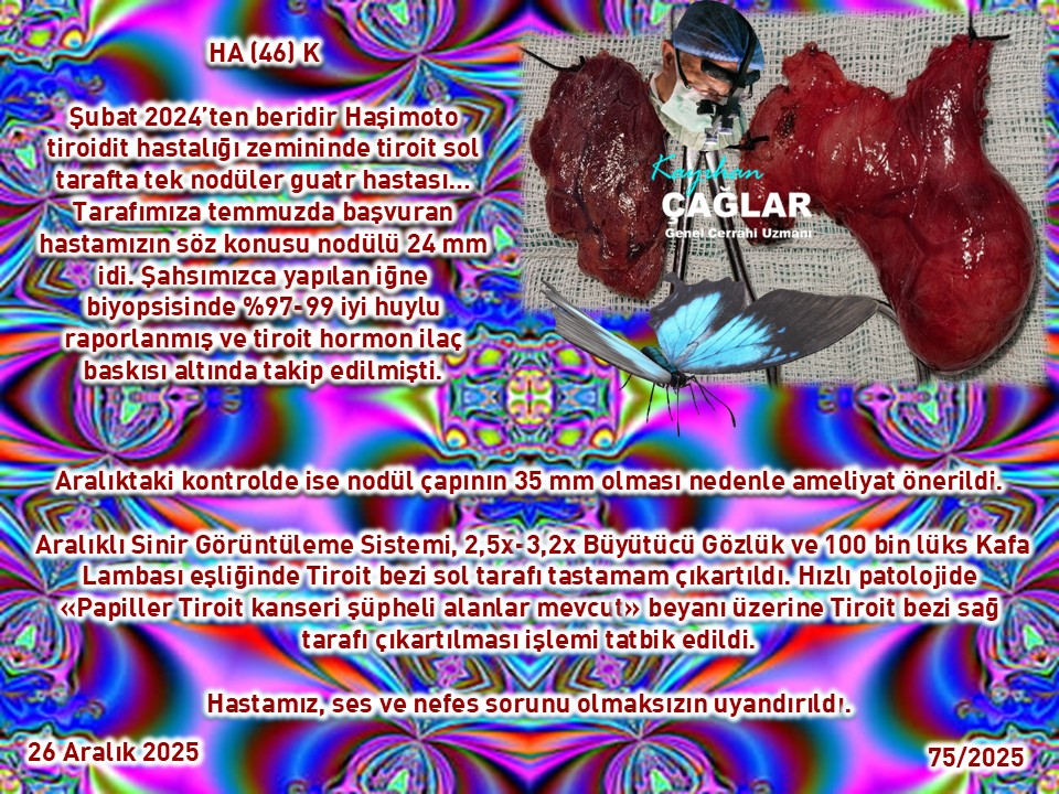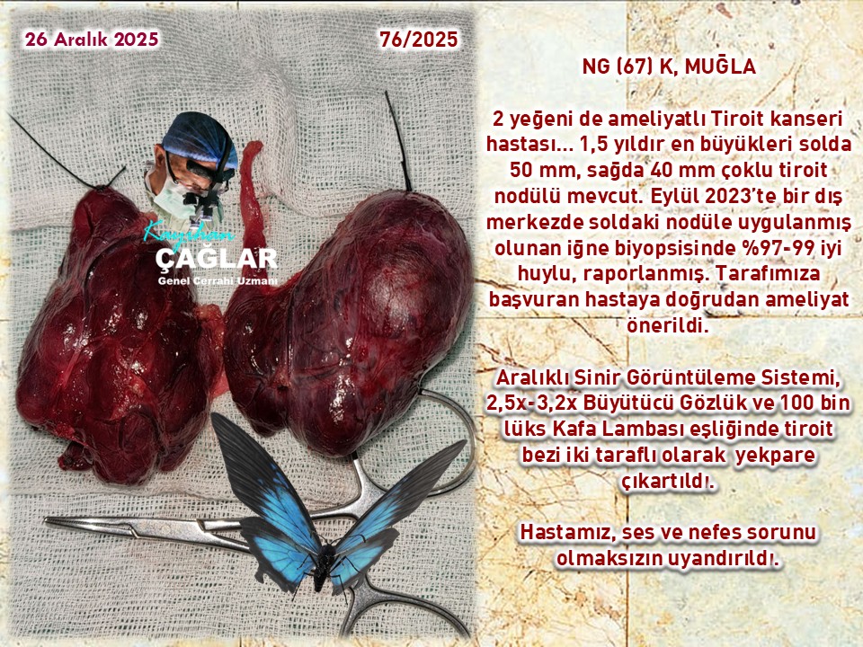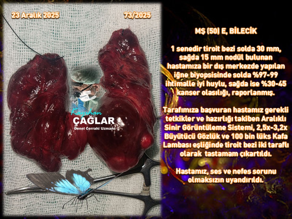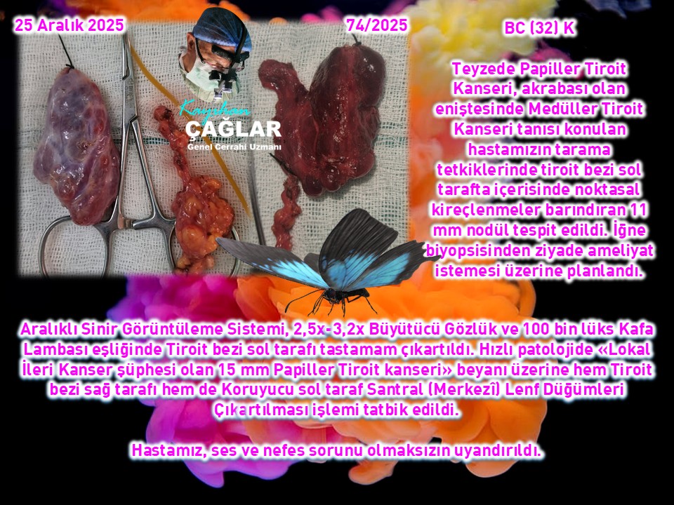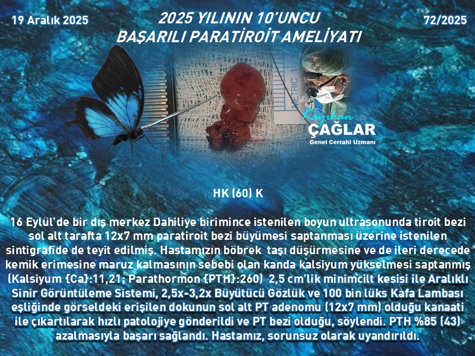 2025 yılının son ve onuncu Paratiroit ameliyatımız olan bir hastamıza da bir dış merkez Dahiliye birimince istenilen boyun ultrasonunda tiroit bezi sol alt tarafta 12x7 mm paratiroit bezi büyümesi (Normali 3-5 mm) saptanması üzerine istenilen sintigrafide de teyit edilmiş. Hastamızın böbrek taşı düşürmesine ve de ileri derecede kemik erimesine maruz kalmasının sebebi olan kanda kalsiyum yükselmesi saptanmış (Kalsiyum {Ca}:11,21; Parathormon {PTH}:260) 2,5 cm’lik minimal cilt kesisi ile sol alt PT adenomu (12x7 mm) olduğu kanaati ile çıkartılarak hızlı patolojiye gönderildi ve PT bezi olduğu, söylendi. PTH %85 (43) azalmasıyla başarı sağlandı. Sabah Ca:8,33 PTH:23 idi.