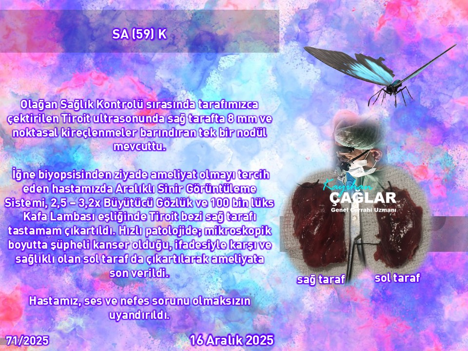 Aralık 2025 döneminde sağ / sol fark etmeksizin 4 hastamızda tek taraflı tiroit bezi çıkartılması işlemi uygulamıştık. 3 hastamızda anlık gönderilmiş olunan hızlı patolojide birinde şüpheli kanser, ikisinde kanser mevcut, denildi.