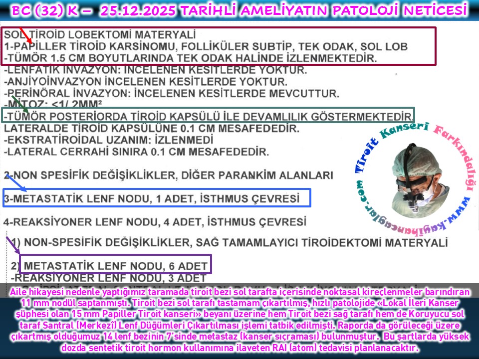 Her üçünde de karşı sağlıklı taraf alınmasına karşın 1 hastamızda ailede hikayesi pozitif olduğundan ilaveten hastalıklı tarafta santral bölge —soluk borusu ile o taraf şah damarı arası, ses siniri etrafı— lenf düğümleri de çıkartıldı. Nitekim kesin patolojisinde 15 mm Papiller Tiroit Kanseri ile beraber çıkartmış olduğumuz 14 adet lenf bezinden 7’sinde metastaz —kanser sataşması— saptanmış oldu. Hastamıza yüksek dozda Sentetik Tiroit Hormonu (STH) başlanmakla beraber RAI —atom— tedavisine yönlendirilecektir. Şüpheli kanser, denilen ikinci hastamızın kesin patolojisinde bir sorun tespit edilmemiştir. Üçüncü hastamızda ilginç olarak sorunlu tarafta 35 mm nodülün 27 mm’sinde Folliküler Tiroit Kanseri anlaşılırken, ameliyat öncesindeki tetkiklerde sağlıklı görülmesine rağmen kanser varlığından bahisle çıkarttığımız tarafta ise ilginç olarak 7 mm ve 14 mm Papiller Tiroit Kanseri saptandı. Bu hastamızda da yüksek dozda STH başlandı ve RAI tedavisi planlandı.
