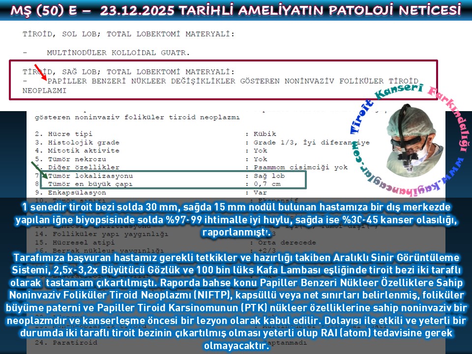 Her iki tarafta da nodül bulunduğundan doğrudan iki taraflı tiroit bezi çıkartılması işlemi uygulanan bir hastamızda kanser saptanmadı, diğerinde 7 mm çapında Papiller Benzeri Noninvaziv Folliküler Tiroit Kanseri (NIFT-P) tespit edildi. Hem çapın <1 cm olmasından hem de NIFT-P’nin artık neredeyse direkt kanser sayılamayabilip kanser öncesi bir durum olabilir, tartışmaları gölgesinde RAI tedavisi gerektirmediği bilgisinden sadece yüksek dozda STH başlandı.