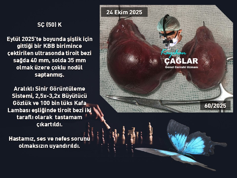 Ekim 2025 döneminde; ikisinde hipertiroidinin (Halk ağzı: Zehirli guatr) eşlik ettiği; birinde sağda 30 mm, solda 25 mm, diğerinde en büyüğü sağda 30 mm; üçüncüsünde de tiroit hormonları normal ancak sağda 40 mm, solda 35 mm olmak üzere çoklu tiroit nodüllü guatr hastalarına iki taraflı tiroit bezi çıkartılması işlemi uyguladık.