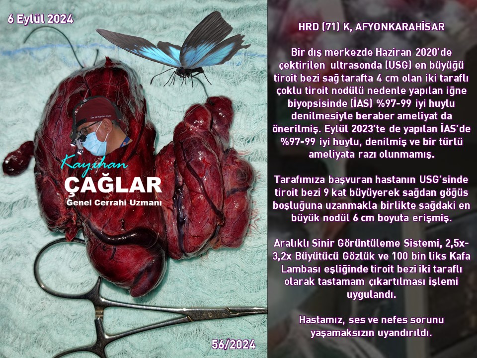 Eylül 2024'te 9 (dokuz) boyun cerrahisi (tiroit / paratiroit / lenf düğümü) ameliyatı olarak teşkil etmiştir. 2024 yılı dokuz ayında boyun cerrahisi ameliyat sayımız 63 (altmış üç) olmuştur. Dolayısıyla 2024 yılında 7 olarak gerçekleşen aylık ortalamamız ile tiroit ameliyatlarında tecrübe sahibi bir cerrah olarak anılmak için gerekli aylık ortalama 8,33' lük ortalamaya yakın bir değere ulaşmış olduk.