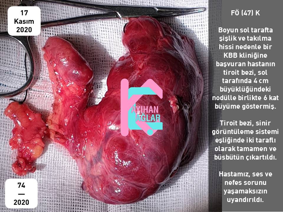 Kasım 2020' de toplamdaki 23 (yirmi üç) ameliyatımızın 9'u (dokuz) tiroit/paratiroit ameliyatı olarak teşkil etmiştir. Bu haliyle koronavirüs nedeniyle planlanabilir ameliyat yapmadığımız nisan ayını hariç tuttuğumuzda 2020 yılındaki on ay için tiroit/paratiroit ameliyat sayımız 80 (seksen) olmuştur. Dolayısıyla 2020 yılında 8 olarak gerçekleşen aylık ortalamamız ile 8,33'lük olağan ortalamaya denk bir değere ulaşmış olduk.