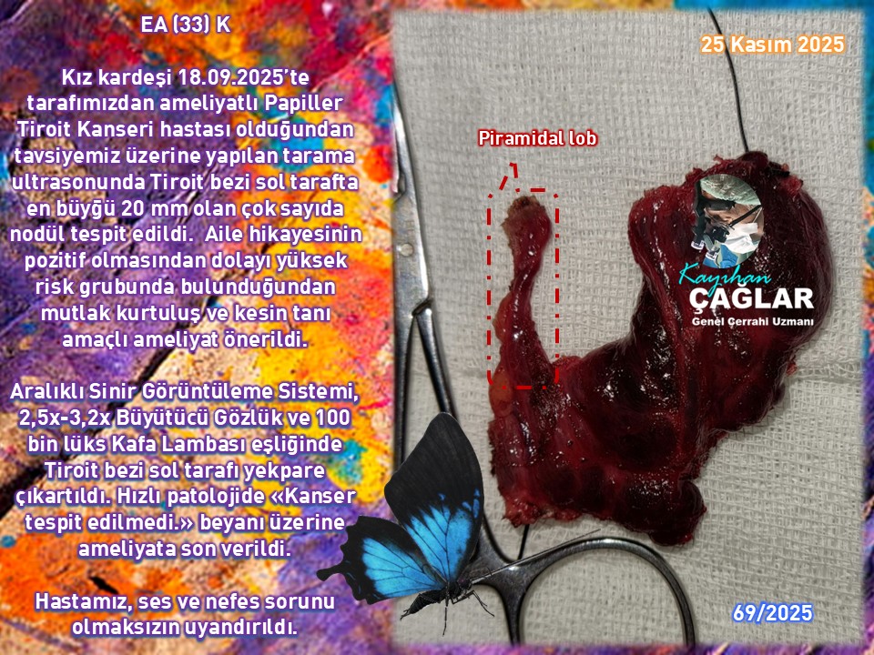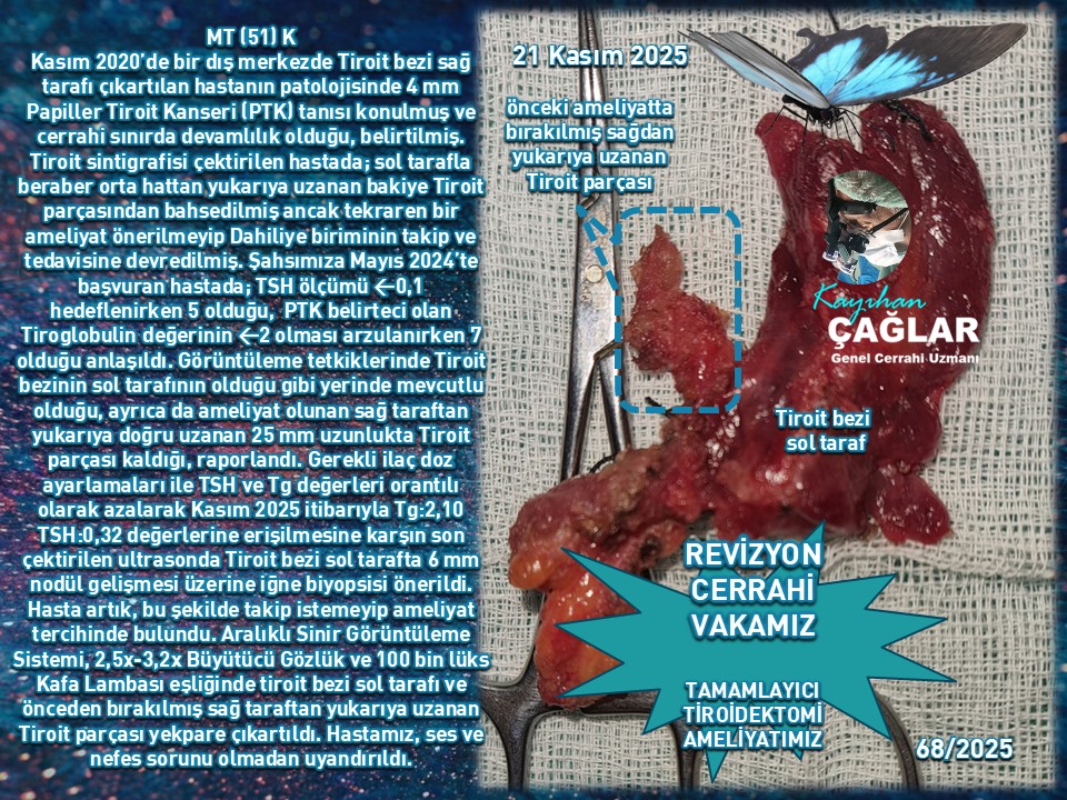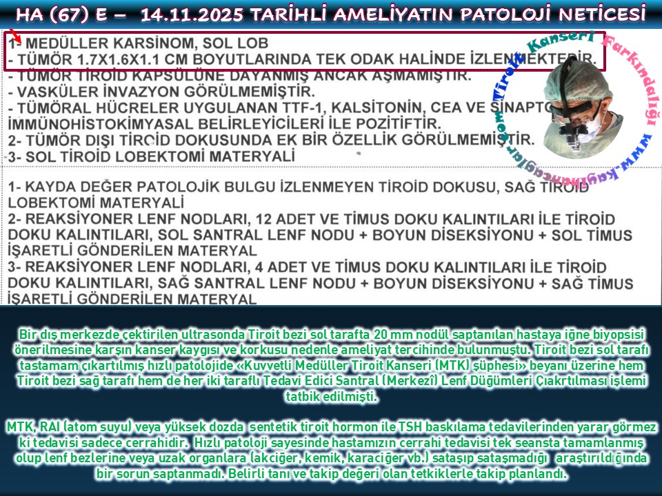 Başka bir hastamız, Kasım 2020’de bir dış merkezde tek taraflı (sağ) Tiroit bezi çıkartılması ameliyatı olup Papiller Tiroit Kanseri tanısı konularak sol taraf için ameliyat önerilmeden takip edilmiş. 4 sene sonunda tarafımıza başvurduğunda sol tarafta 6 mm nodül belirmesi üzerine tedavinin tamamlanması ve nodülün izahı için sola revizyon cerrahisi uygulandı, patolojisi olağandı.