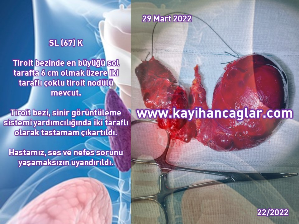 Mart 2022'de toplamdaki 17 (on yedi) ameliyatımızın 7'si (yedi) boyun cerrahisi (tiroit / paratiroit / lenf düğümü) ameliyatı olarak teşkil etmiştir. 2022 yılı üçüncü ayı için toplam boyun cerrahisi ameliyat sayımız 22 (yirmi iki) olmuştur. Dolayısıyla 2022 yılında 7,33 olarak gerçekleşen aylık ortalamamız ile tiroit ameliyatlarında tecrübe sahibi bir cerrah olarak anılmak için gerekli aylık ortalama 8,33' lük ortalamaya yakın bir değere ulaşmış olduk.