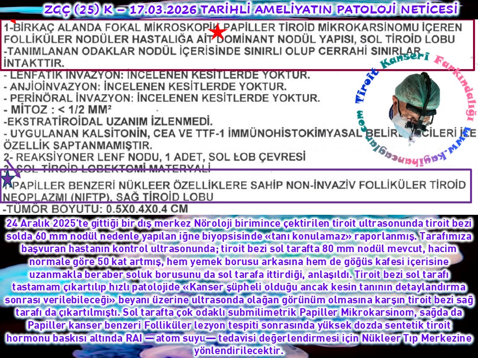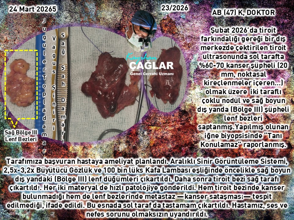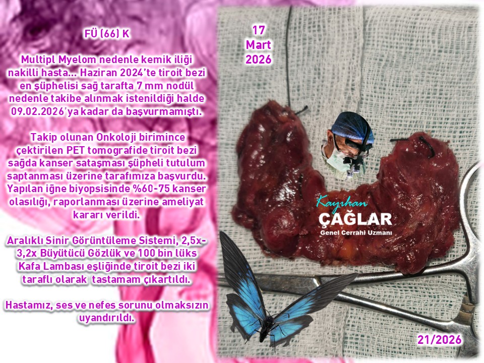 İki taraflı tiroit bezi ameliyatlı 3 hastamızın birinde kanser saptanmadı. Diğer biri kemik iliği nakilli (Multipl Myelom) hasta idi. Haziran 2024’te tiroit bezi en şüphelisi sağ tarafta 7 mm nodül nedenle takibe almak istediğimiz halde 09.02.2026’ya kadar da başvurmamıştı. Takibindeki Onkoloji birimince çektirilen PET’te sağda kanser sataşması şüpheli tutulum üzerine yine başvurduğunda yaptığımız iğne biyopsisinde %60-75 kanser olasılığı, raporlanarak ameliyat edildi. Kesin raporda 9 mm PTK saptandı.